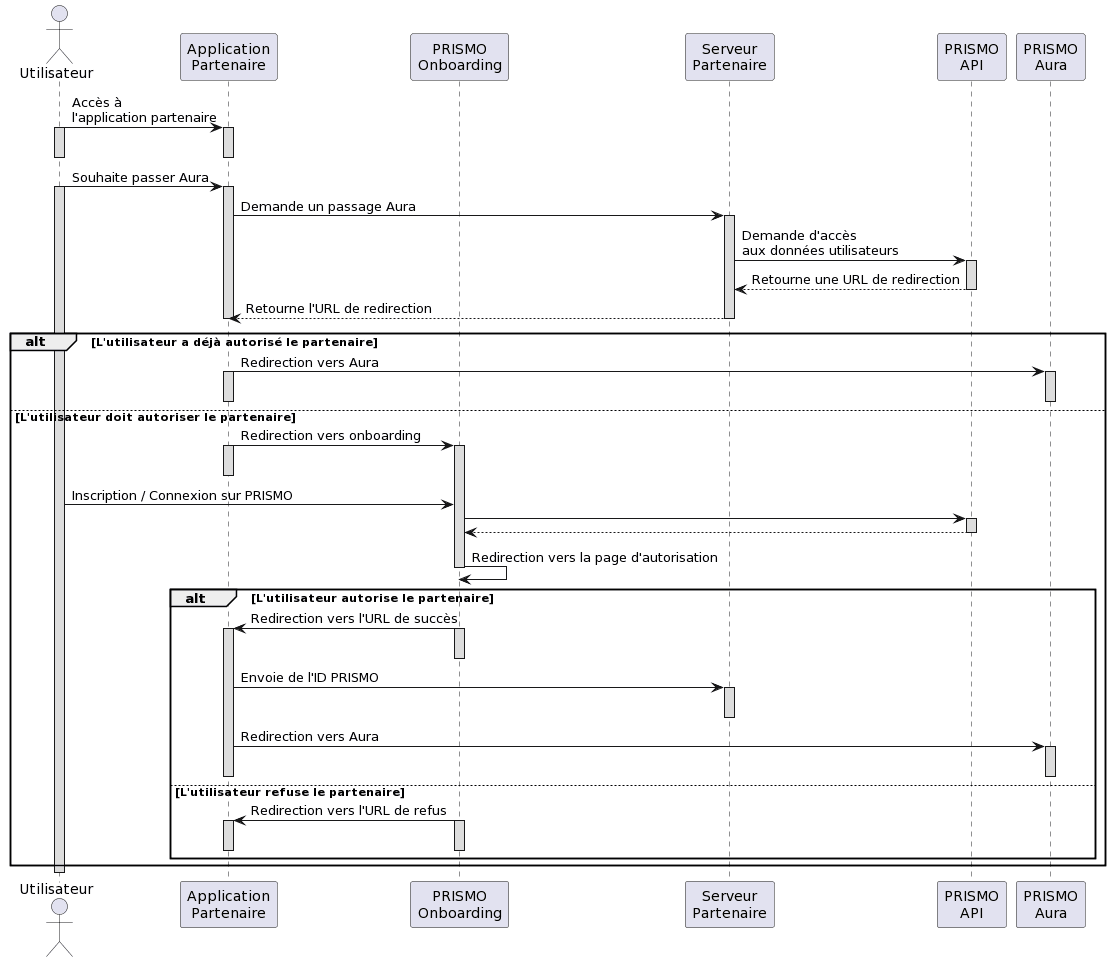 https://example.com/success?partnerUserId=<string>&prismoId=<string>&redirectTo=<url>&application=<AURA|HELIO|APP>&finish=<boolean>&nonce=<string>PRISMO_ID Cette étape permet au partenaire de récupérer l'identifiant PRISMO de l'utilisateur (prismoId). Cet identifiant sera utilisé plus tard.